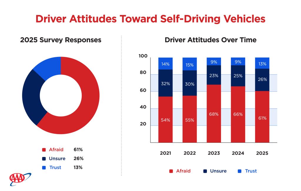 据IT之家了解,AAA 对 888 名受访者进行的调查显示,消费者对自动驾驶汽车的信任度从去年的 9% 略微上升至 13%。然而,仍有 61% 的驾驶员对自动驾驶汽车感到害怕,26% 的人表示不确定。此外,消费者对技术持续发展的热情也在下降,从 18% 降至 13%。与此同时,78% 的美国人希望汽车制造商优先提升汽车安全系统。