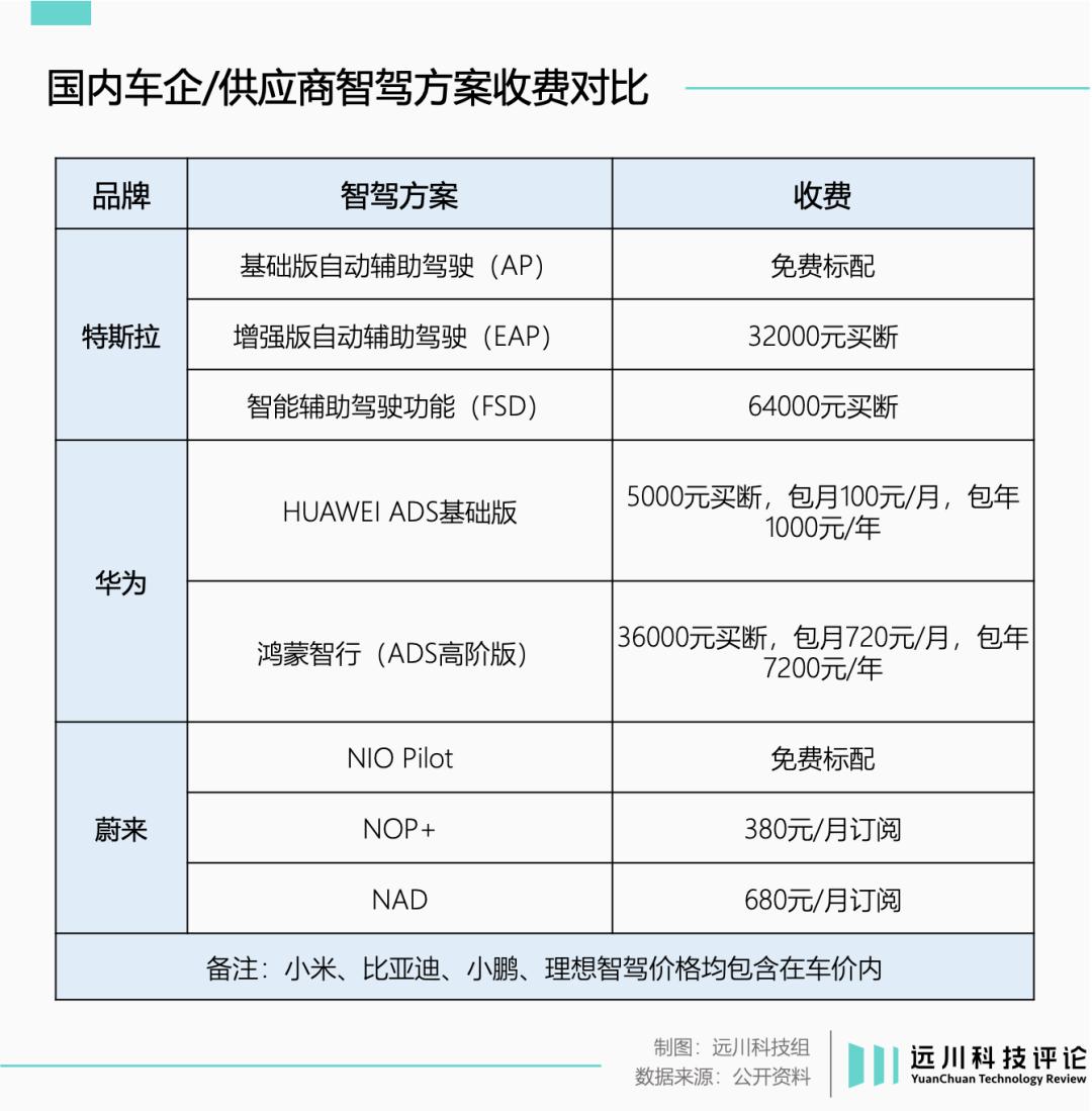 大部分专业测评将FSD对标L2级别智驾,与之同一级别的国产智驾方案里,最贵的是鸿蒙智行的HUAWEI ADS高阶版,买断价36000元,蔚来NOP+每月380元,用特斯拉FSD的买断价,可以用满十四年(168个月)。