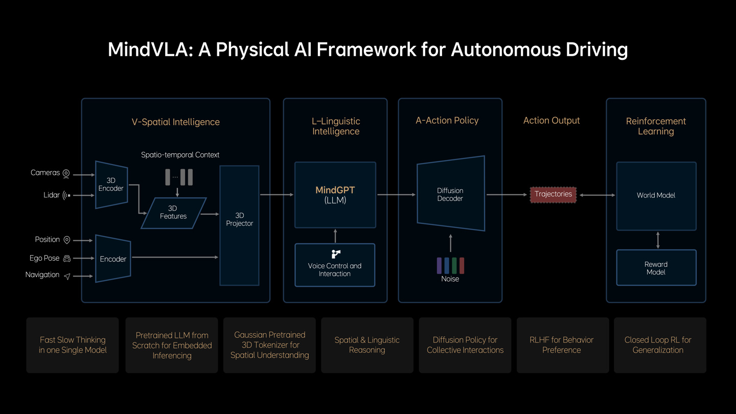 理想汽车 CEO 李想介绍称:“MindVLA 是一个视觉-语言-行为大模型,但我们更愿意将其称为‘机器人大模型’,它将空间智能、语言智能和行为智能统一在一个模型里,让自动驾驶拥有感知、思考和适应环境的能力,是我们通往 L4 路上最重要的一步。”