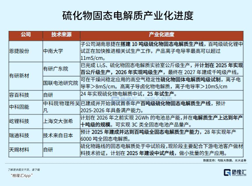 目前,部分企业已具备硫化物固态电解质吨级量产能力,未来两年将有十吨级到百吨级生产线落地,以有高校背景的初创企业和传统锂电材料企业为主。