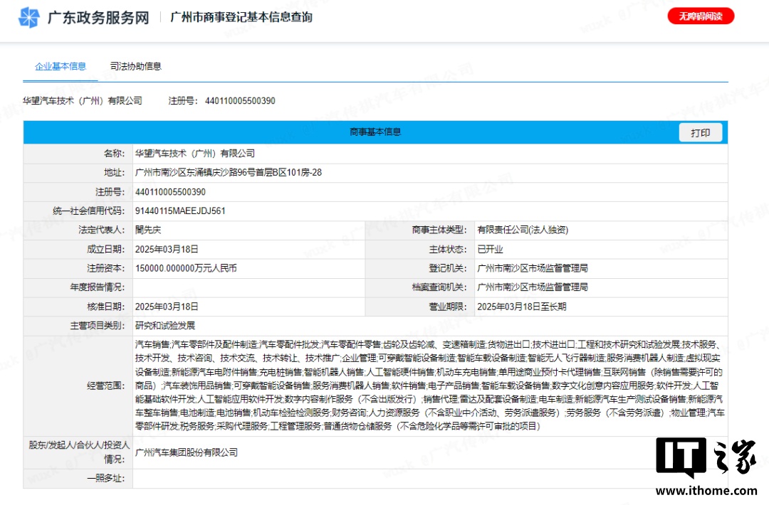 IT之家 3 月 19 日消息,IT之家从广汽集团官方微信公众号获悉,由广汽集团投资 15 亿元设立的新公司华望汽车技术(广州)有限公司(下称“华望汽车”)于 3 月 18 日正式成立,全新高端智能汽车品牌也将在不久公布。