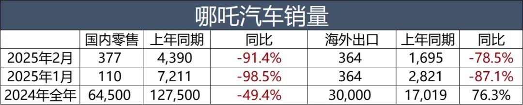 就2024年全年业绩看,哪吒国内销量为6.45万辆,同比跌幅49.4%,比2023年 12.75万辆腰斩;而出口是亮点,从2023年的17,019辆同比大涨76.3%至近3万辆。这也是前面员工还拿“出口”作为救命稻草说辞的底气。