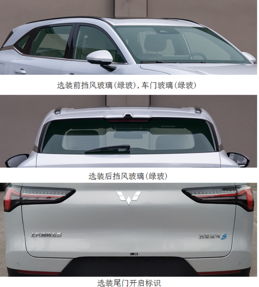 该车可选装双目摄像头(前挡风玻璃上)、后单目摄像头(后扰流板上)、前摄像头、前雷达(6 点式)、后雷达(6 点式)、天窗、尾门开启标识;选装前挡风玻璃(绿玻)、车门玻璃(绿玻)、后挡风玻璃(绿玻);车型可选装 ETC 车载装置,原版是没有的。
