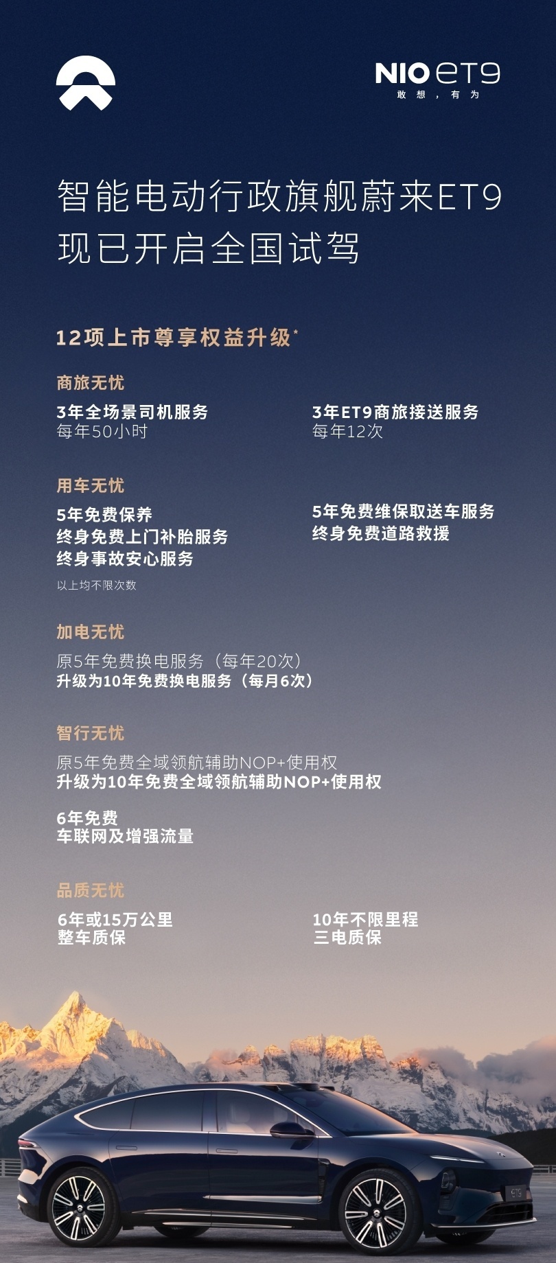 IT之家 3 月 20 日消息,蔚来汽车今日宣布,蔚来 ET9 行政旗舰轿车开启用户试驾,并将于 3 月 29 日开启全国用户交付,12 项上市尊享权益中的「加电无忧」及「智行无忧」权益进行限时升级。