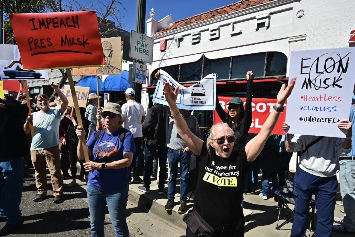 这场抗议活动始于2月初的特斯拉几个展厅,随后迅速蔓延至全球数百个地点,越来越多的人走上街头抗议特斯拉CEO埃隆·马斯克(Elon Musk)介入政治。(作者/箫雨)