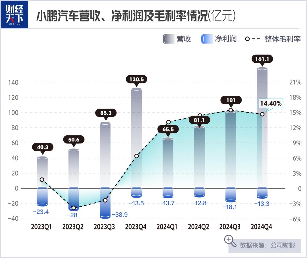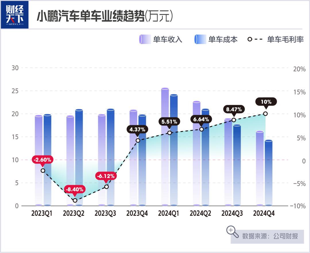 而小鹏汽车还处于亏损卖车的阶段,去年全年净亏损57.9亿元,同比缩减了44.2%。好在小鹏汽车的汽车业务毛利率已经由2023年的-1.6%转正到了全年的8.3%。而第四季度整体毛利率达到了14.4%,汽车毛利率提升至10%,实现了连续六个季度环比增长。