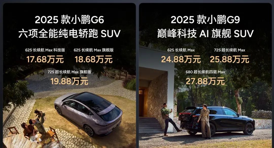 在小鹏汽车2025年春季发布会上,带来了2025款小鹏G6与小鹏G9。其中2025款小鹏G6推出3款车型,售价区间17.68-19.88万元。更新了34.3%的关键一级总成件,并升级81项功能。2025款小鹏G9同样带来3款车型,售价区间24.88-27.88万元。新车包含66项升级。此外,两款车型均全系标配图灵AI高阶智驾、800V高压SiC碳化硅平台、5C超充AI电池、骁龙8295P座舱。