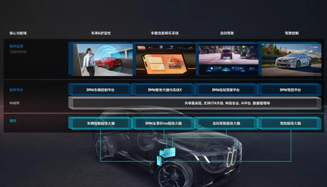 宝马集团发布了全新一代智能电子电气架构,覆盖全动力系统和全细分车型,集成四台高性能计算平台——“超级大脑”,分别驱动车载娱乐、自动驾驶、驾驶动态控制以及基础能力,算力较现款车型提升20倍以上。