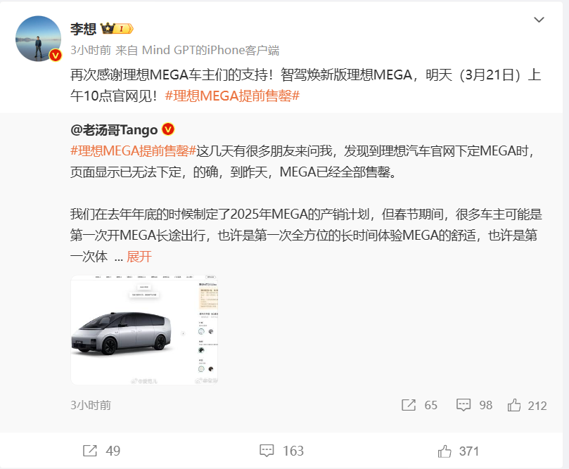 据此前消息,理想汽车产品线负责人曾透露,截至昨天,很多消费者在理想汽车官网下定MEGA时,页面显示已无法下定,目前MEGA已全部售罄。此外,此次发布的新车型也将于明日起开启预订。