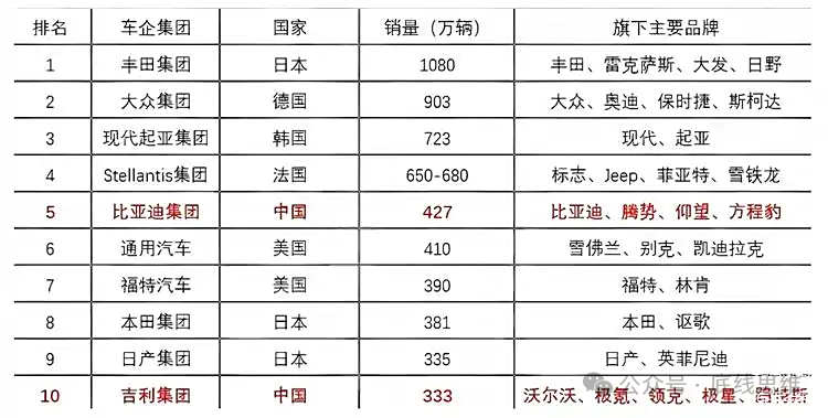根据GlobalDate近期公布的数据,在2024年全球汽车销售排行榜中,日本的丰田集团以1080万台的销量连续五年蝉联榜首,德国大众集团以903万台位居第二,韩国现代集团排名第三。而我们中国的车企,比亚迪集团近几年势头凶猛,但也排在斯特兰蒂斯集团之后占位第五,销量427万辆,不及丰田或大众一半;值得一提的是,吉利集团销量333万辆,虽相对较少,但是首次冲进榜单前十,离第九的日产集团仅差2万辆。