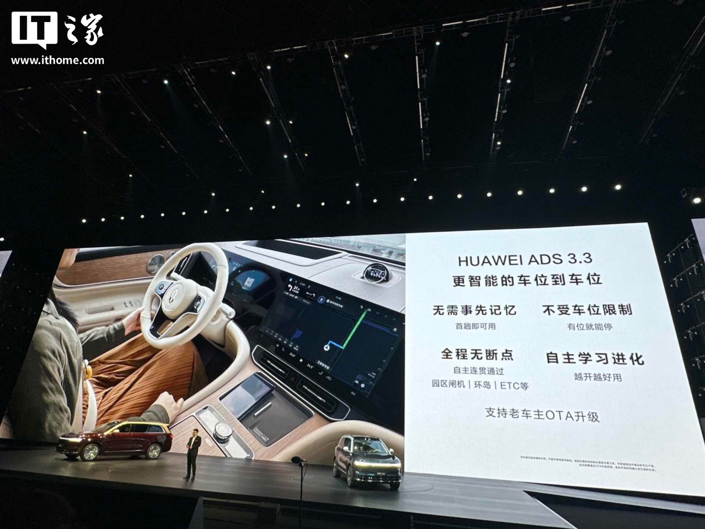 华为 ADS 3.3 无需事先记忆,不受车位限制,全程无断点,支持自主学习进化,还支持老车主 OTA 升级。