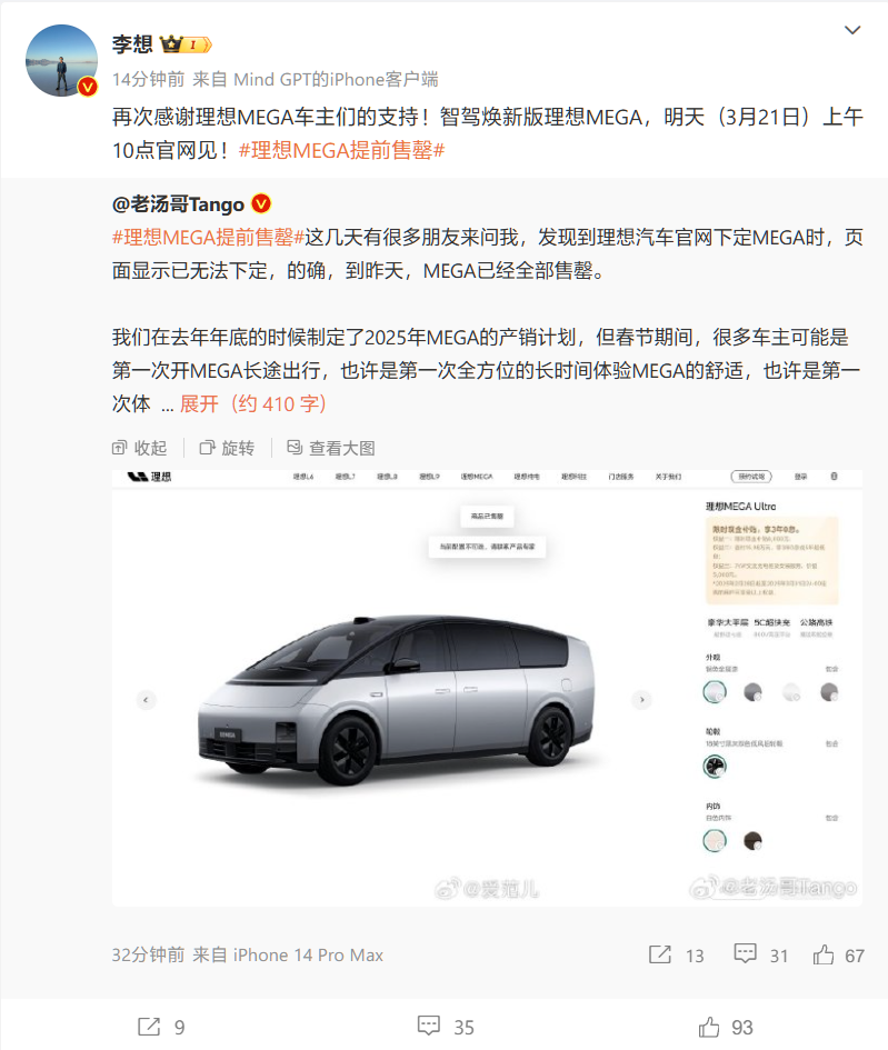 理想汽车产品线负责人 @老汤哥Tango 则在早些时候发文透露,截至昨日(IT之家注:3 月 19 日),理想 MEGA 已经全部售罄,此次官宣的新款车型明日起开启预订。