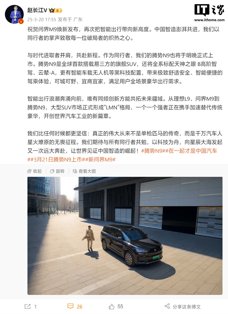 IT之家 3 月 20 日消息,今天傍晚,比亚迪腾势销售事业部总经理赵长江在微博发文,为今天刚刚上市的 2025 款问界 M9 送上祝贺:“祝贺问界 M9 焕新发布,再次把智能出行带向新高度。中国智造澎湃共进,我们以同行者的掌声致敬每一位破局者的炽热之心。”