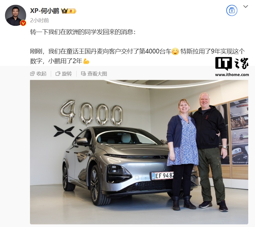 IT之家 3 月 20 日消息,小鹏汽车董事长何小鹏今日转发了欧洲同事发回来的消息,表示小鹏汽车在丹麦向客户交付了第 4000 台车,特斯拉用了 9 年实现这个数字,小鹏用了 2 年。