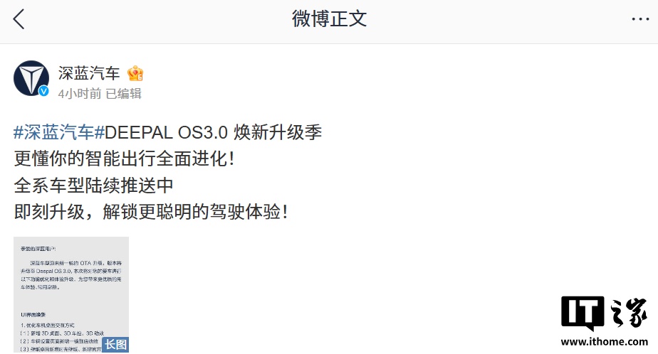 IT之家 3 月 20 日消息,深蓝汽车今日发布 DEEPAL OS 3.0 系统 OTA 升级公告,新版本深度融合 DeepSeek,支持多轮对话与上下文理解、实时信息获取与更新等能力,官方称“全系车型陆续推送中”。