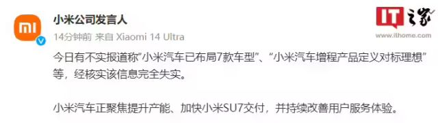 不过从 2024 年 7 月开始,有三则消息显示,小米确有打造增程车的规划。