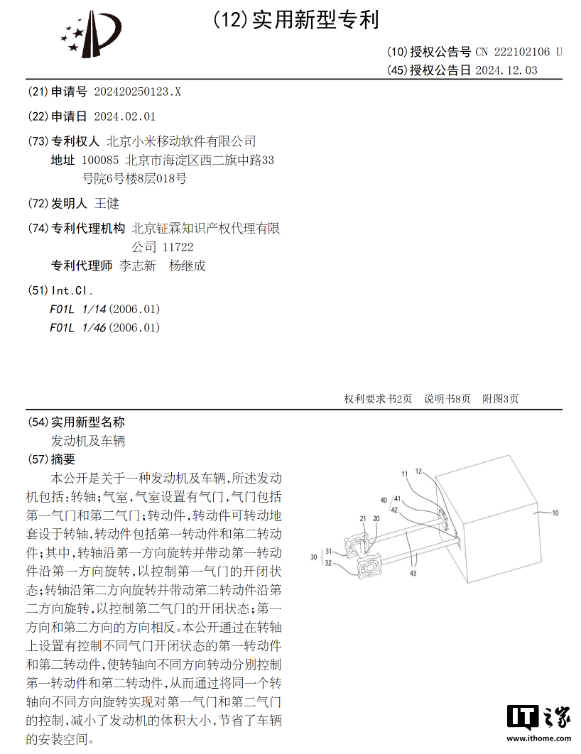 第三则来自小米获批的专利:有一项名为“发动机及车辆”的专利,可以减小发动机的体积大小、节省车辆的安装空间。