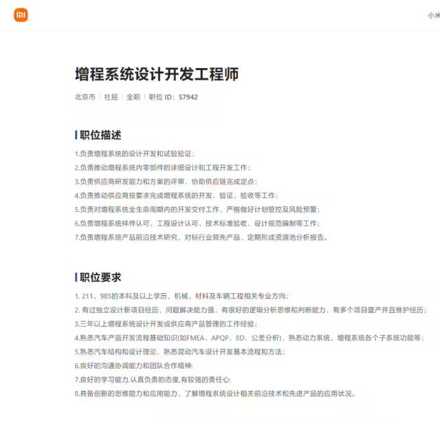 在 2023 年 10 月,有网友曾发现小米社招官网页面上线了几个跟汽车相关的职位,且都跟增程式汽车有关,由此,关于“小米将推出 SUV 车型”的传言在坊间蔓延开来。