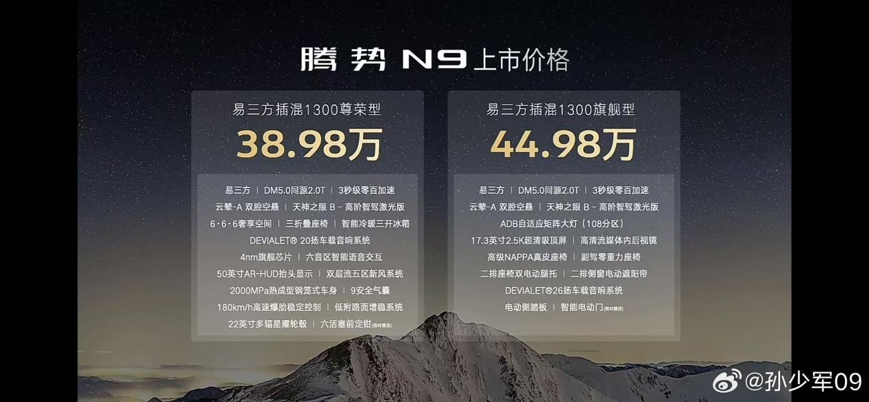 凤凰网科技讯 3月21日,比亚迪集团在深圳举办发布会,宣布子品牌腾势的旗舰大型SUV车型N9正式上市,提供2种配置可选,官方指导价分别为尊荣型38.98万元,旗舰型44.98万元。