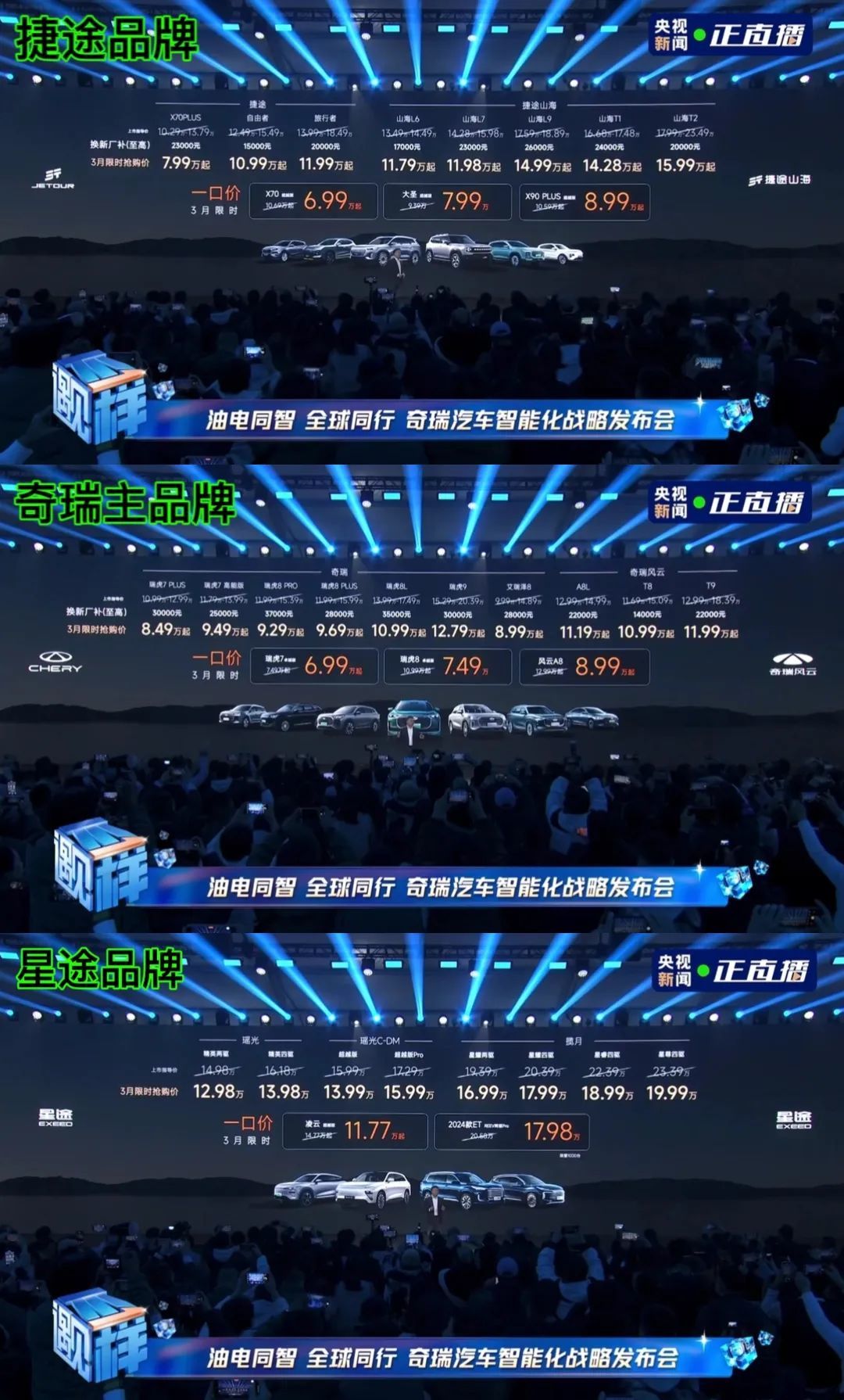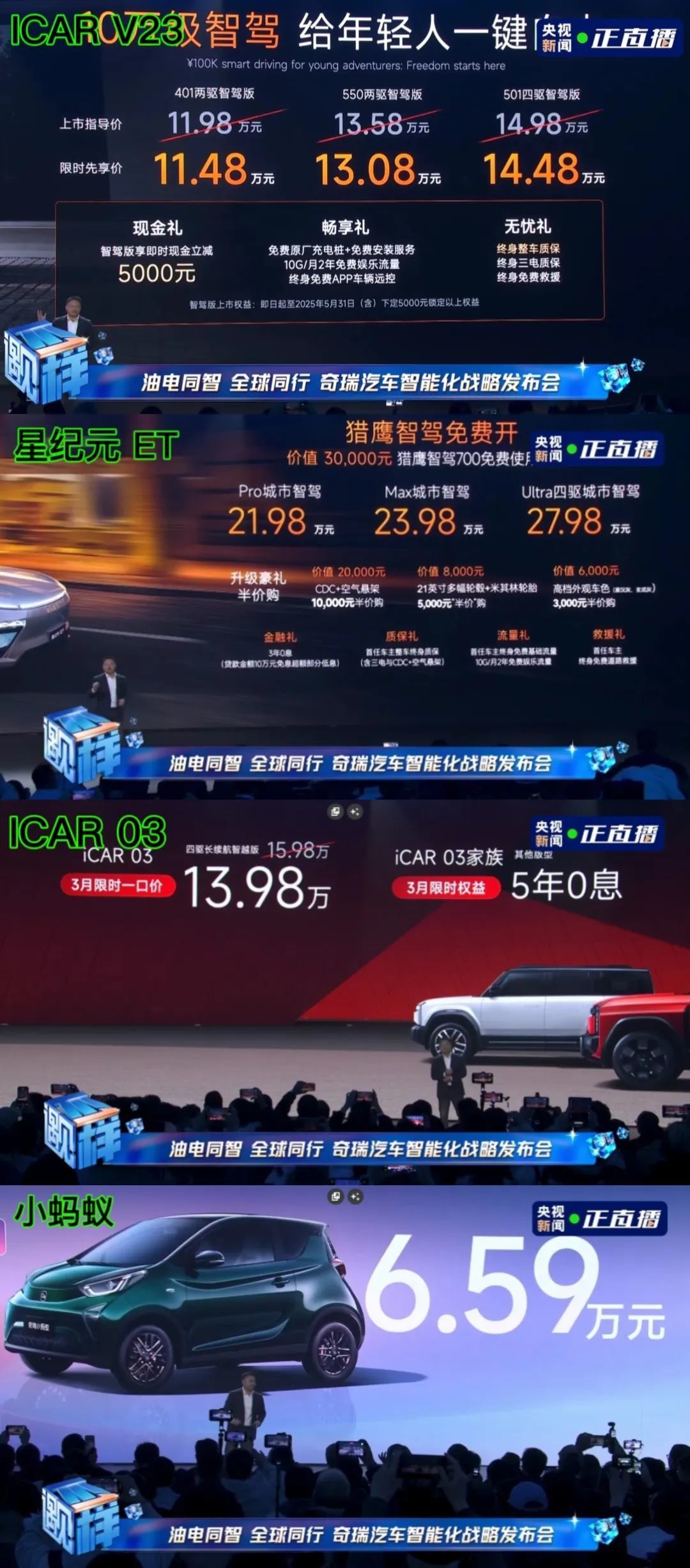 吉利这次的发布会主要专注于高端智驾,但奇瑞则不一样了,除了推出中高低全覆盖的猎鹰智驾之外,还带来了 40 多个车型的一口价???