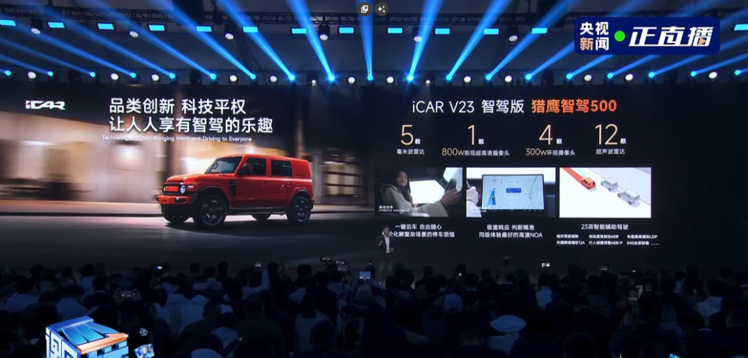 这次的重点是猎鹰智驾 500 ,作为一个面向中低端车型的版本,它率先搭载在了最近大火的 iCAR V23 上,并且全系标配。