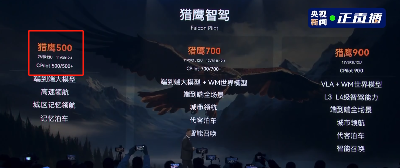 猎鹰 700 ,增加世界模型,最重要的是加上激光雷达了,能做到城区 NOA 、代客泊车、智能召唤等第一梯队的功能。