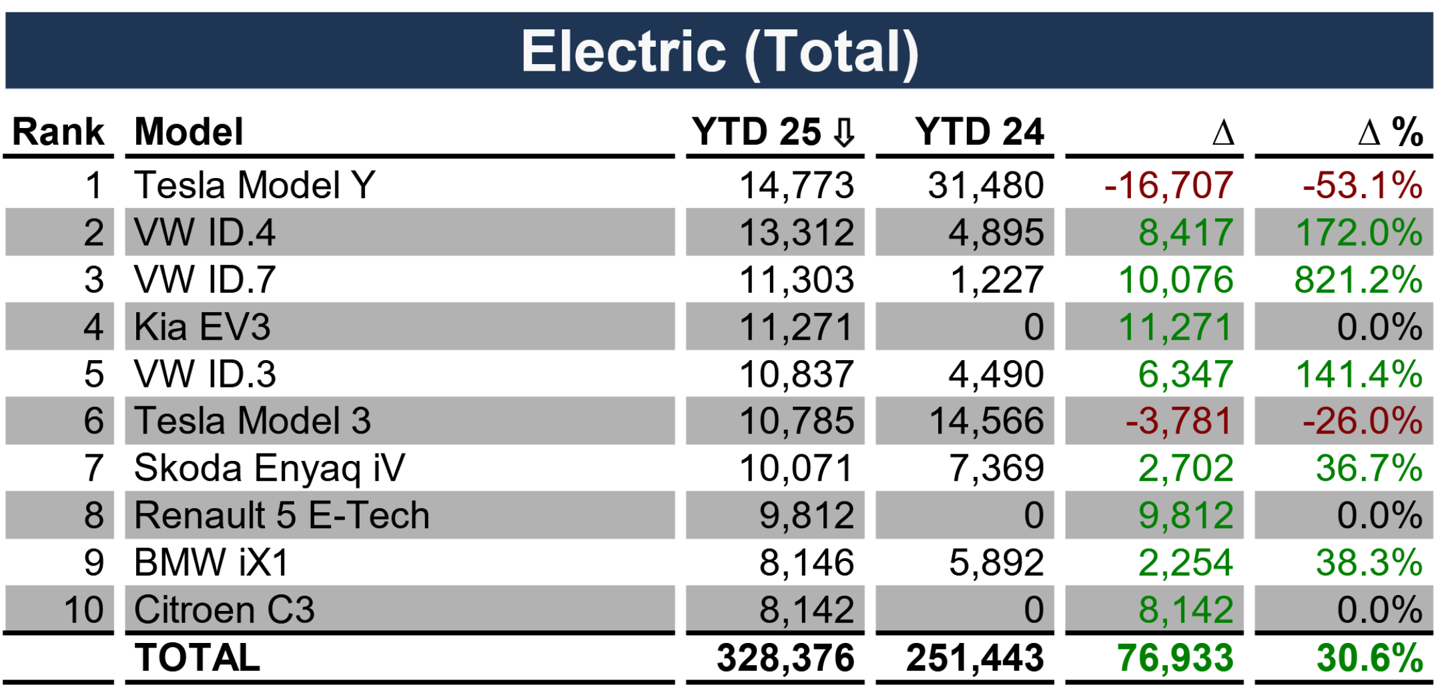 欧洲电动车销量前十榜单中还出现了两款新车型:雷诺 5 E-Tech(第 8 名,9,812 辆)和雪铁龙 e-C3(第 10 名,8,142 辆),其他上榜车型包括起亚 EV3(第 4 名)、斯柯达 Enyaq iV(第 7 名)和宝马 iX1(第 9 名)。