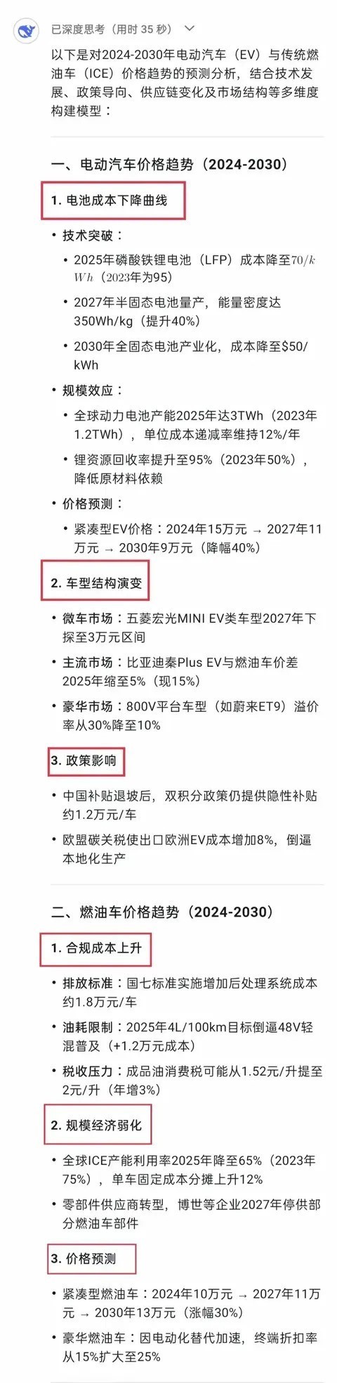 DeepSeek的这一预测颇具趣味性。近年来,电动汽车行业发展迅猛,电池技术持续进步,按理说成本应该逐步下降。如果出现重大的技术突破,例如续航里程大幅增加同时成本显著降低,那么电动汽车的价格可能会以超出预期的速度下降。相比之下,燃油车受到环保政策等因素的影响,可能会面临更多的使用限制,价格也可能因此产生波动。例如,目前某些地区已经实施了对燃油车的限购措施,这无疑对燃油车的价格产生了影响。