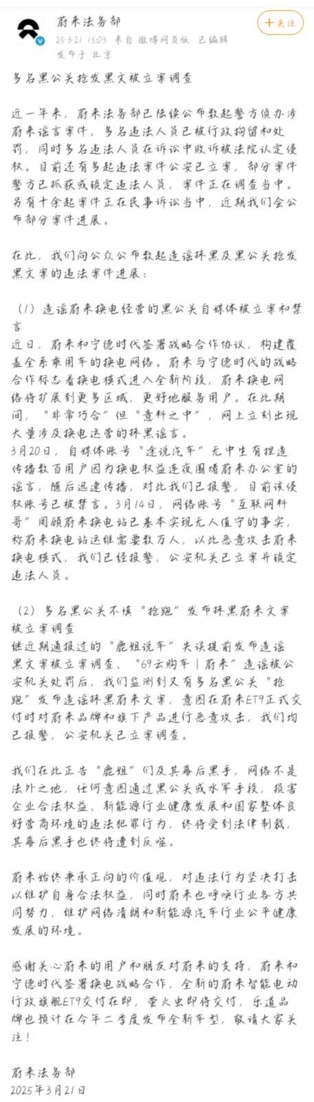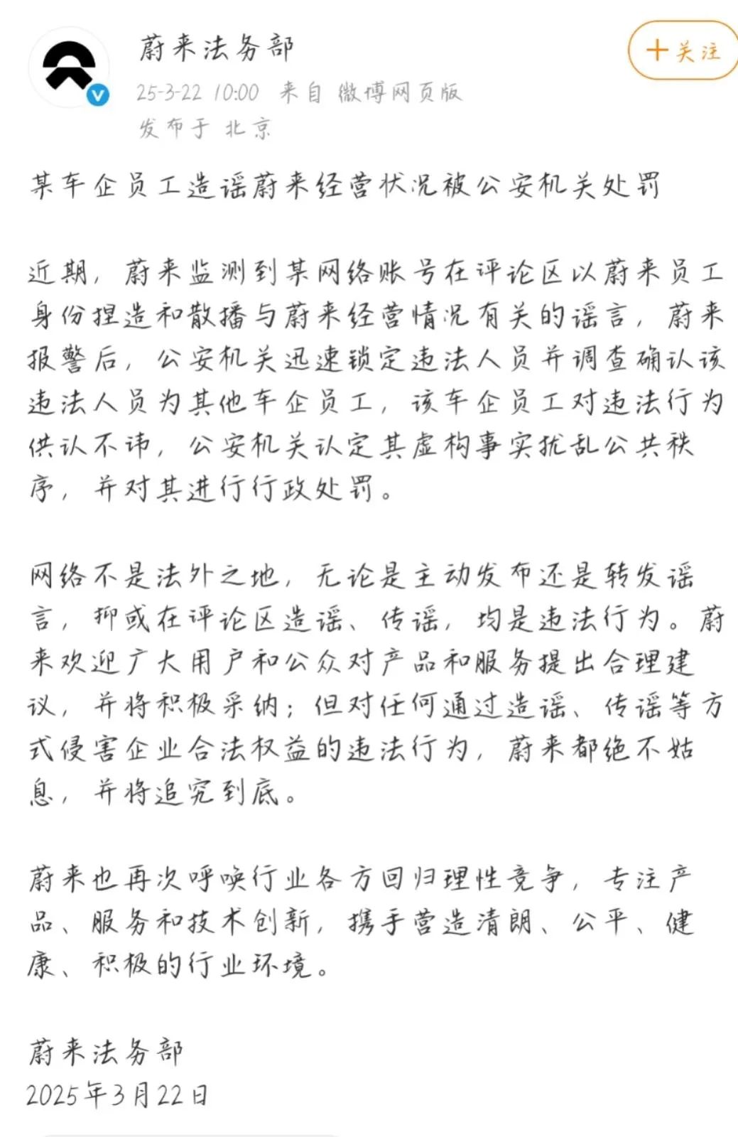 3月22日,蔚来法务部在微博发文,称某车企员工造谣蔚来经营状况被公安机关处罚。