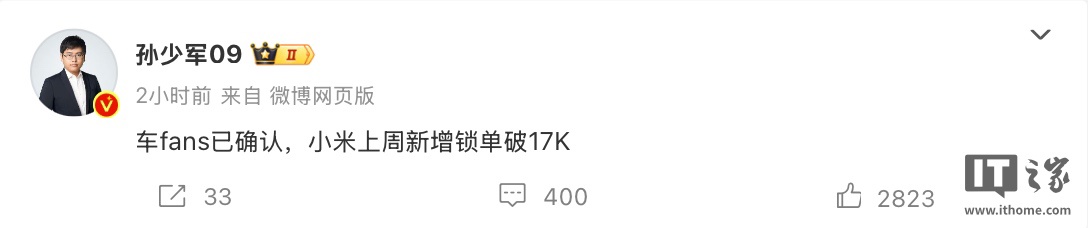 IT之家 3 月 24 日消息,博主“孙少军 09”发文,透露小米汽车上周(2025 年 3 月 17 日至 3 月 23 日)新增锁单超 1.7 万台。作为比较,IT之家注意到今年 2 月小米汽车交付量约 2 万台。