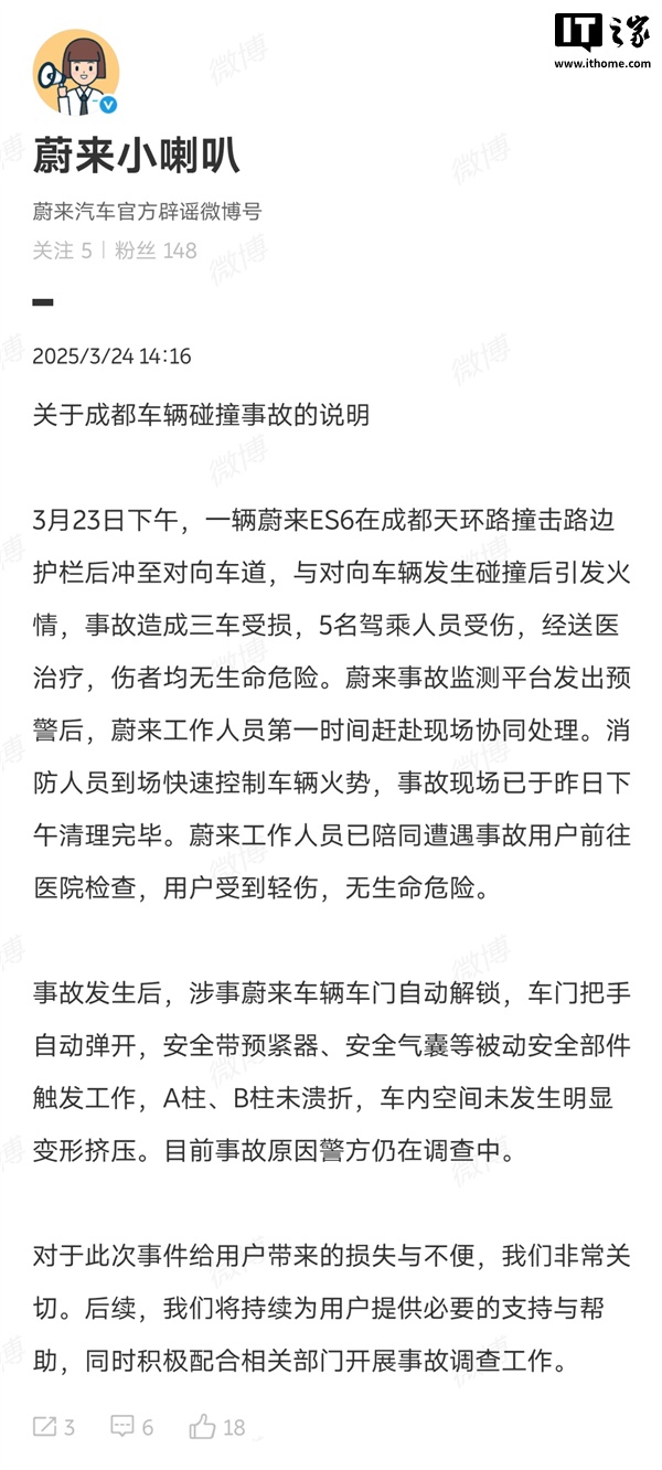 今日下午“蔚来小喇叭”官方发布了成都车辆碰撞事故的说明,IT之家附声明原文如下: