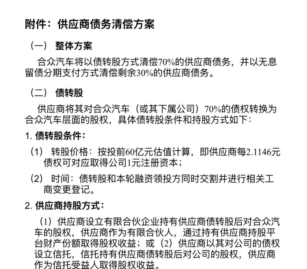 针对众多大小不一的供应商,哪吒汽车还提供了多个“化债”方案,据轩辕商业评论报道,目前主流的一个方案是,供应商70%的债权将转化为哪吒汽车母公司合众汽车层面的股权,剩余30%的债权则将作为无息留债以现金方式分期清偿。