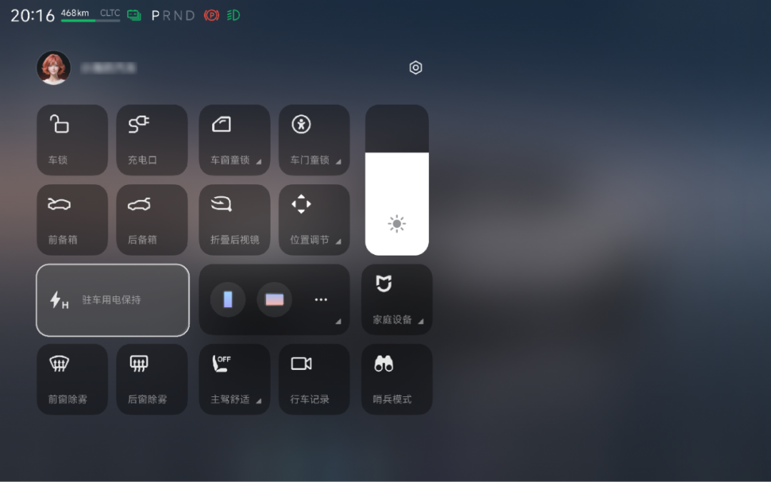 开启方式为:请在中控屏上边缘向下滑动拉出「控制中心」,点击「驻车用电保持」,设置好关闭时间后即可开启。您可以将用电保持的时长设置为 15 分钟~6 小时,车辆会在电量消耗至 20% 时自动退出。
