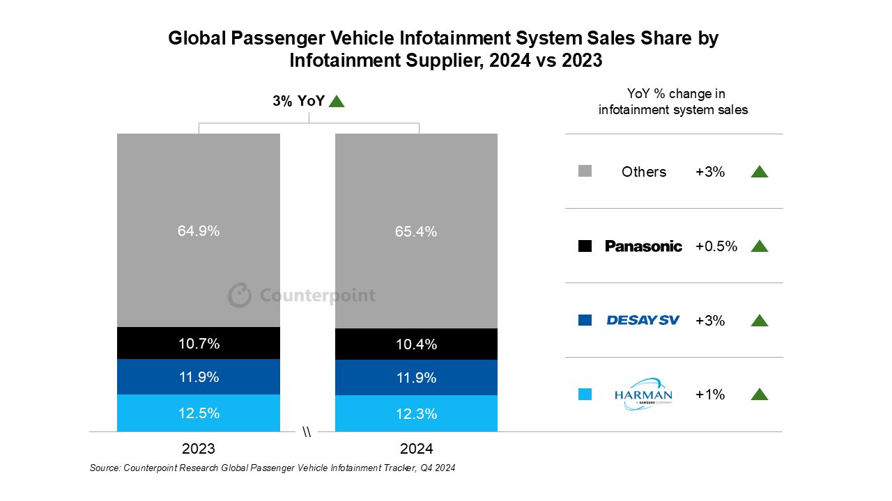 IT之家 3 月 25 日消息,市场调查机构 CounterPoint Research 昨日(3 月 24 日)发布《全球乘用车信息娱乐系统追踪报告》,称 2024 年全球乘用车(PV)信息娱乐系统销售额同比增长 3%,与整体乘用车市场表现一致。