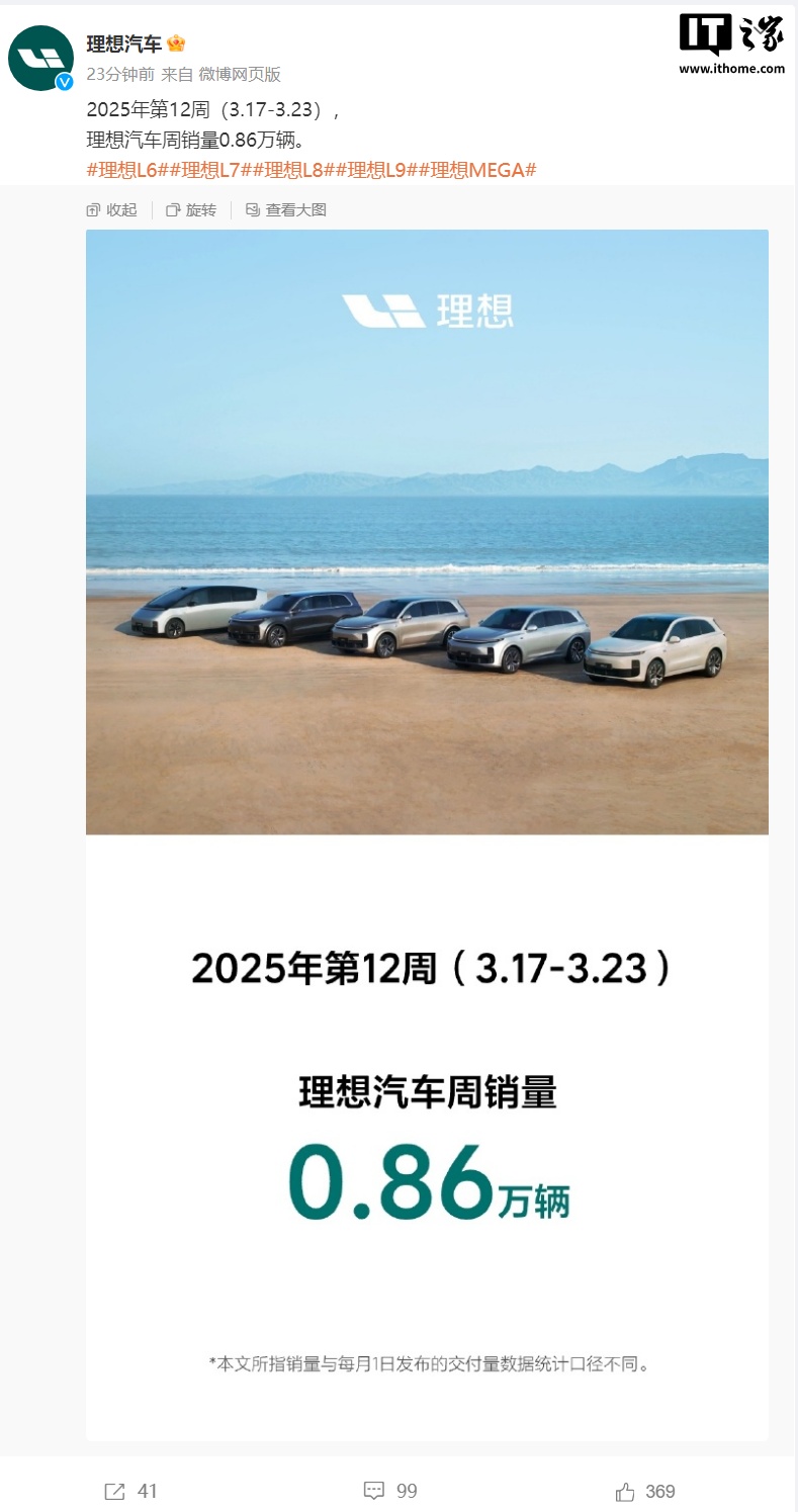 2025 年第 12 周(3.17-3.23),理想汽车周销量 0.86 万辆。