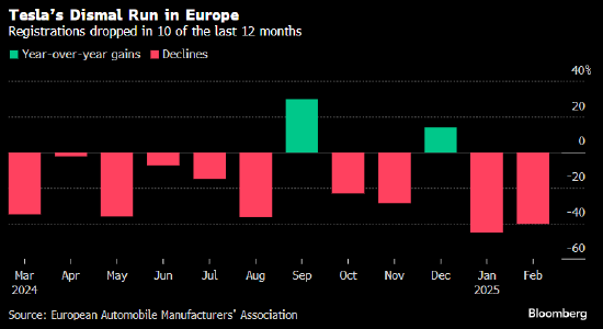 特斯拉2月整体汽车市场份额降至1.8%(去年同期为2.8%),在纯电动车市场份额缩水至10.3%(去年同期为21.6%)。其在欧盟、英国和欧洲自由贸易联盟国家的销量不足1.7万辆,较2024年同期2.8万辆显著下滑。