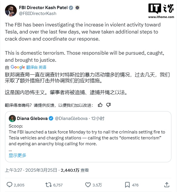 IT之家 3 月 25 日消息,近日美国得克萨斯州一家特斯拉经销商在其场所内发现了多个“易燃装置”,事件发生后,联邦调查局(FBI)与当地执法部门迅速作出反应。此次事件标志着 FBI 新成立的特别行动组正式展开行动,旨在打击那些针对特斯拉车主和经销商的暴力行为。这一举措的背景是特斯拉首席执行官埃隆・马斯克与美国政府关系日益密切,同时他还兼任“DOGE 效率部门”的负责人。