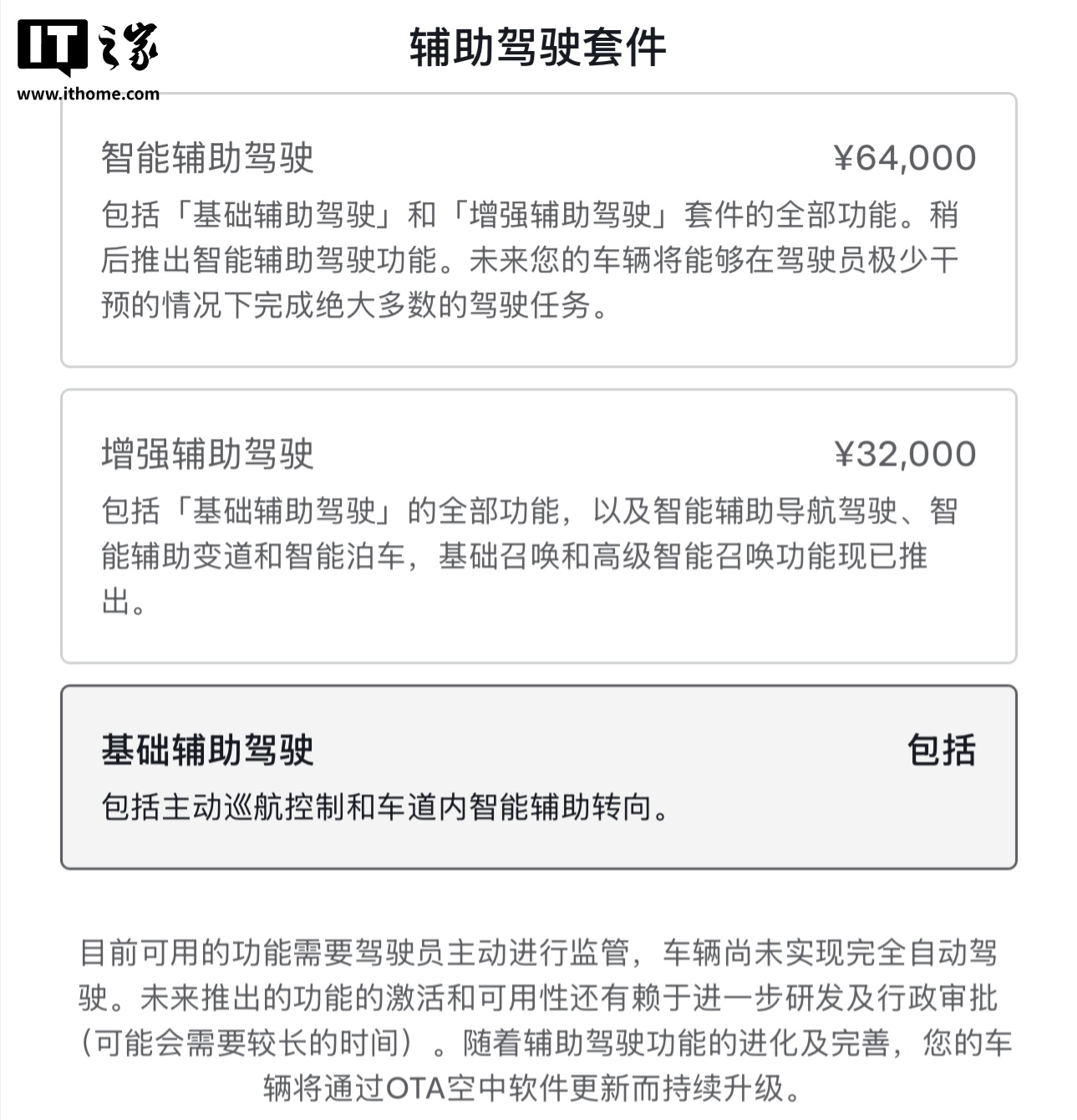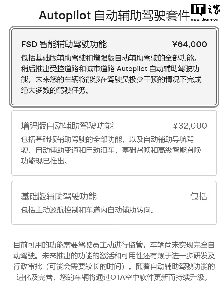 IT之家 3 月 25 日消息,特斯拉中国官网调整了辅助驾驶系统的命名,“Autopilot 自动辅助驾驶套件”改名为“辅助驾驶套件”,其中的“FSD 智能辅助驾驶”改名为了“智能辅助驾驶”。