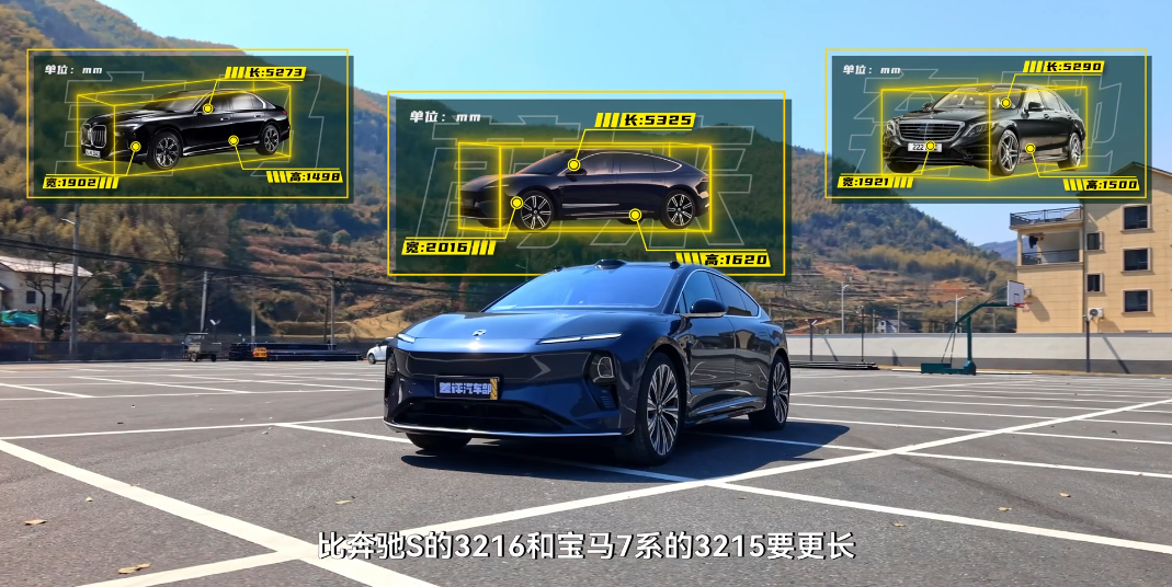 先看它的外观尺寸, ET9 的尺寸明显对标奔驰 S 和宝马 7 系,车身达到 5325 × 2016 × 1620 ,轴距 3250 。ET9 的车长在两者之间,车身更宽、更高,而且轴距也更长,空间必然是吊打这俩了。
