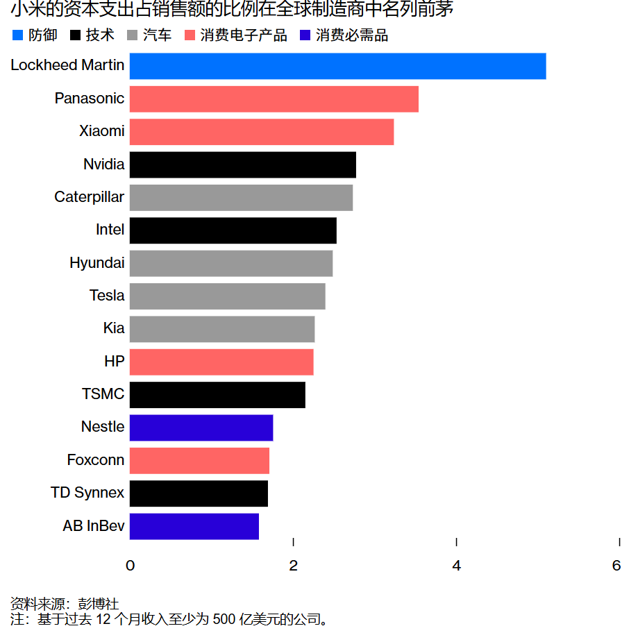 这很好地体现了小米的产品开发方式。尽管它有时被视为轻资产企业,更依赖广告和在线服务销售而非实体设备,但它实际上是最积极的投资者之一。在彭博社有可比数据的36家全球大型制造商中,按资本支出与折旧的比例来看,只有洛克希德・马丁公司和松下控股公司的投入比小米更多。