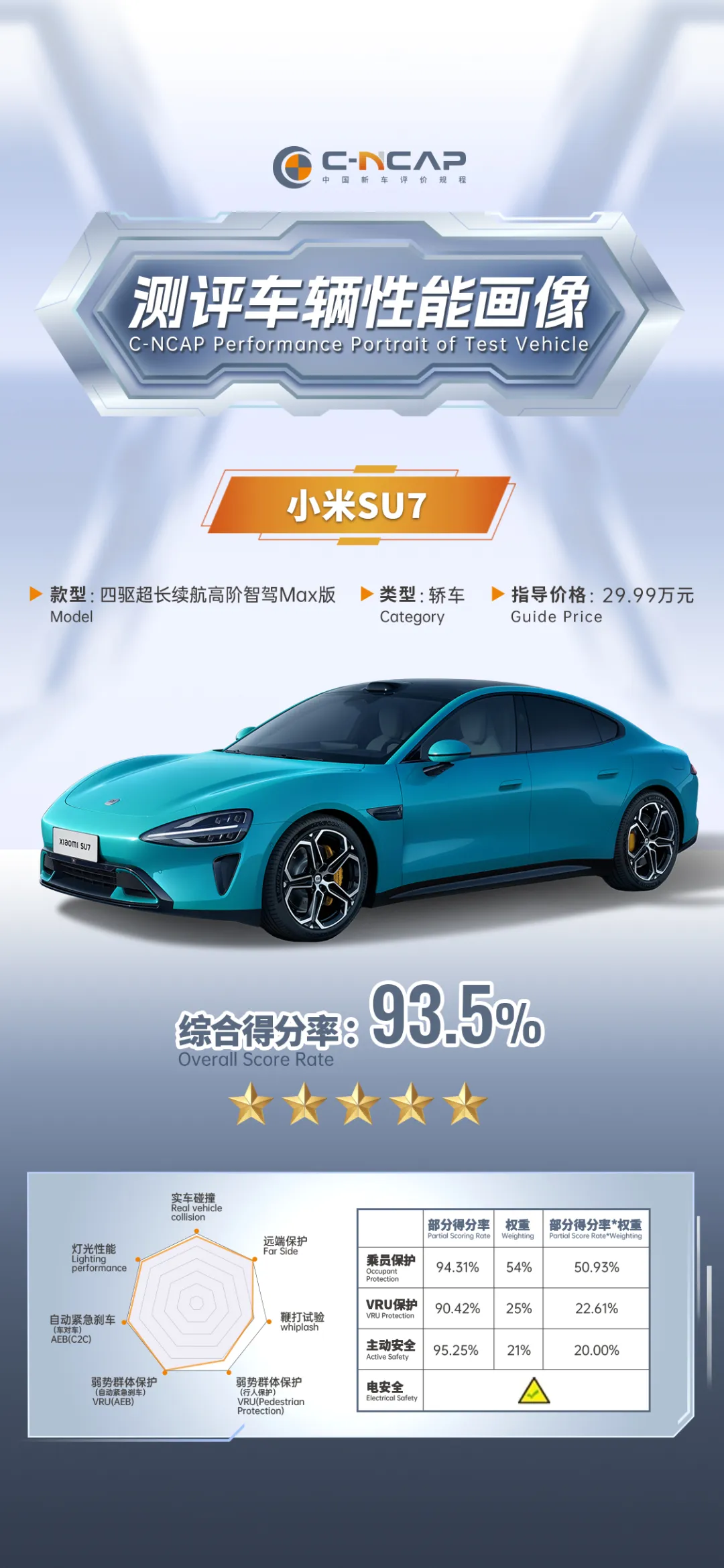 IT之家 3 月 26 日消息,中汽测评 25 日公布了小米汽车科技有限公司生产的小米牌 XMA7000MBEVA1 型纯电动轿车(小米 SU7 四驱超长续航高阶智驾 Max 版)测评结果:综合得分率 93.5%,主动安全得分率、VRU 保护得分率、乘员保护得分率均高于已测车型平均水平。