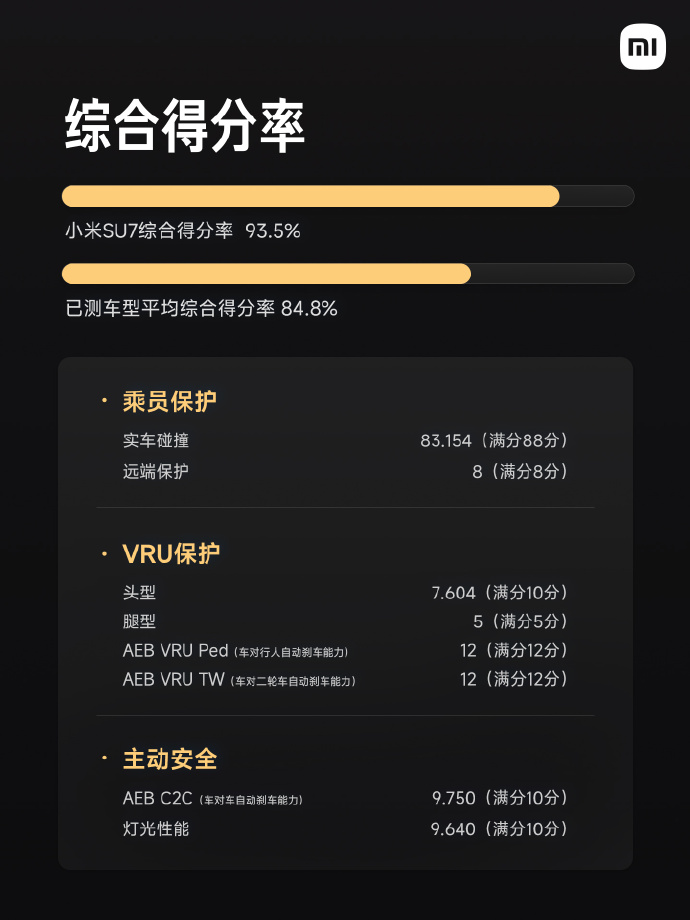 综合得分率:小米 SU7 为 93.5%,高于已测车型平均得分率 84.8%