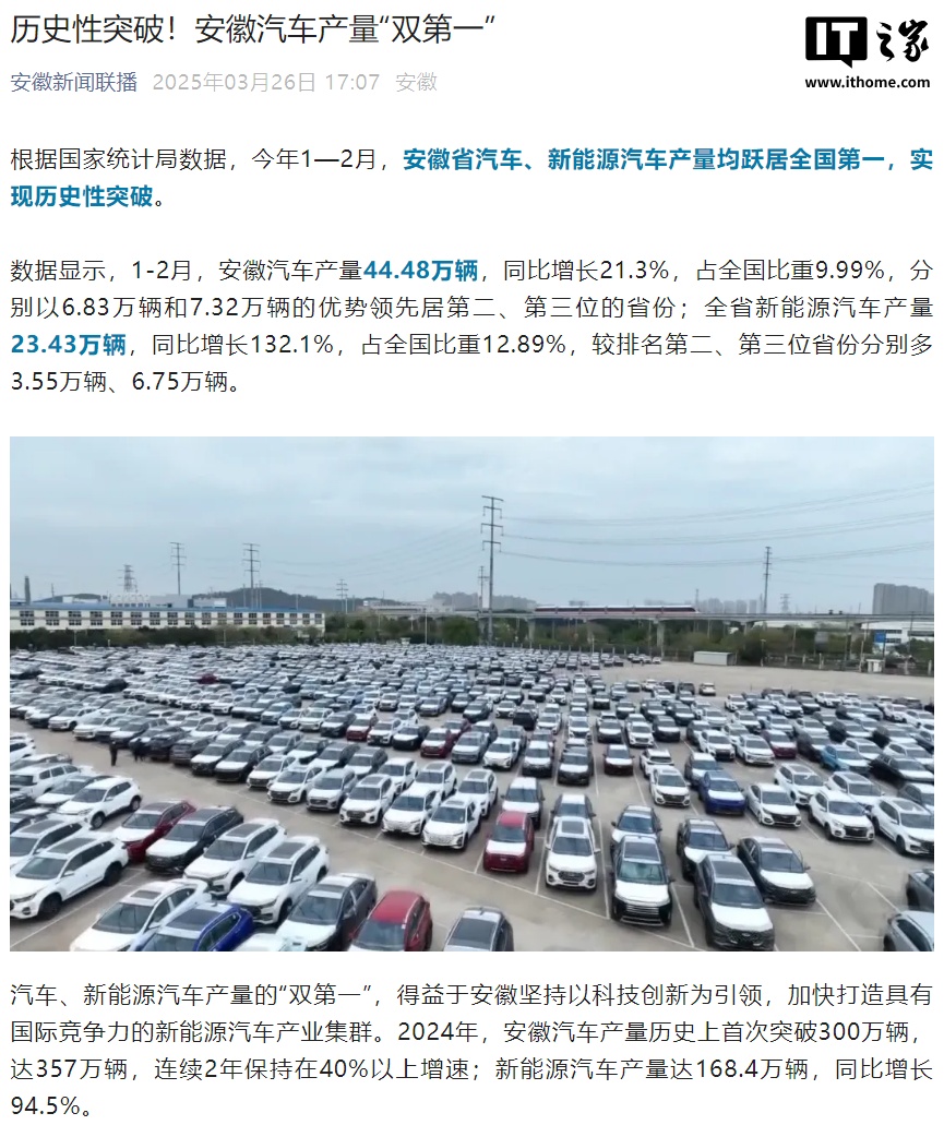 IT之家 3 月 26 日消息,据安徽新闻联播今日报道,根据国家统计局数据,今年 1—2 月,安徽省汽车、新能源汽车产量均跃居全国第一。