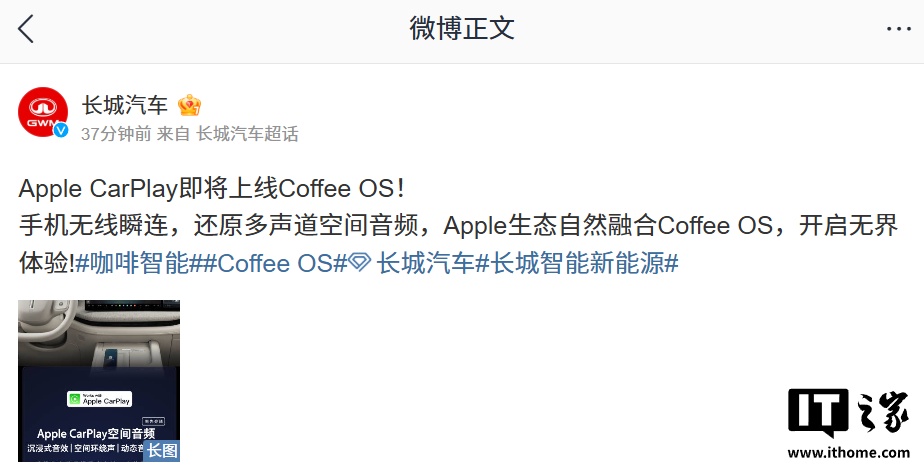IT之家 3 月 27 日消息,长城汽车官方今日发文宣布:Apple CarPlay 即将上线 Coffee OS。