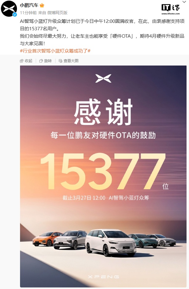IT之家 3 月 27 日消息,小鹏汽车宣布,AI 智驾小蓝灯升级众筹计划已于今日中午 12:00 圆满收官,并对支持项目的 15377 名用户表示感谢。