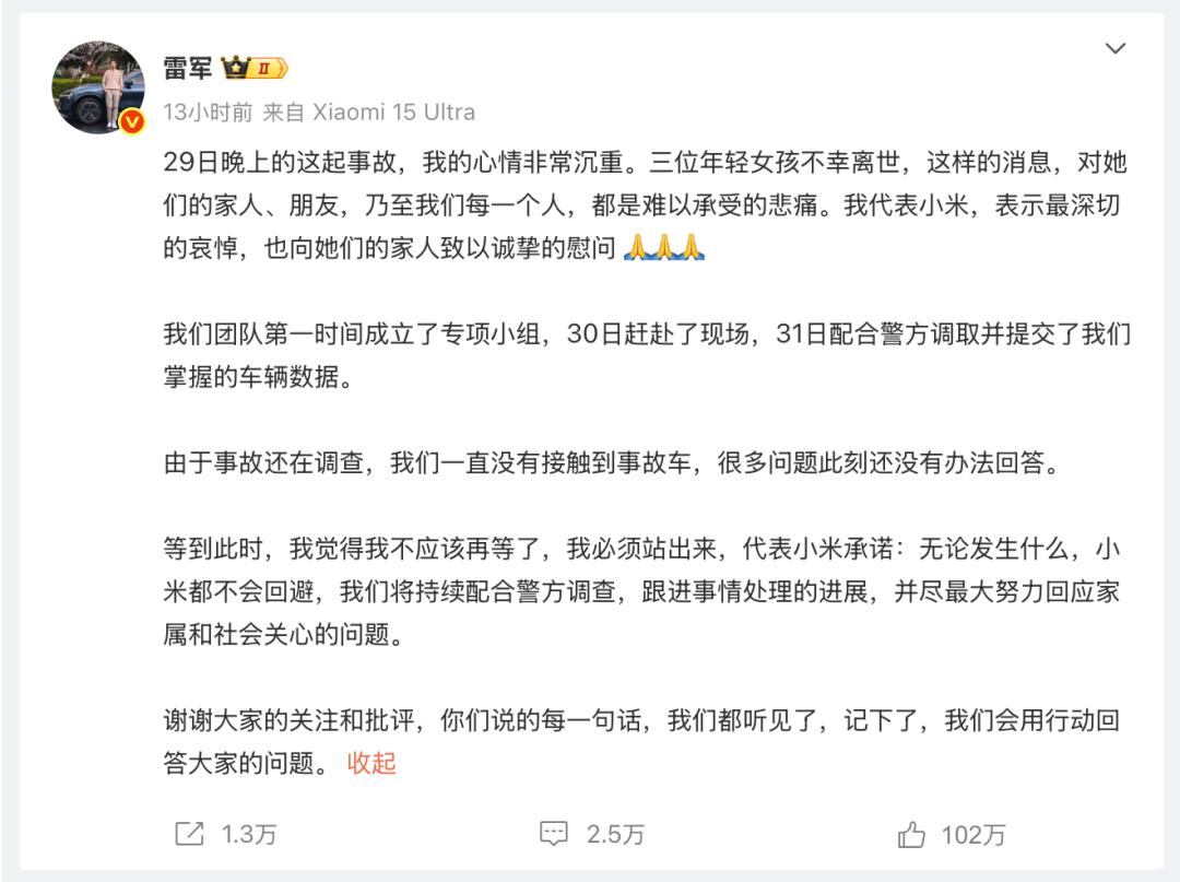 雷军几乎于同一时间发布了回应微博。他在回应中称,“由于事故还在调查,我们一直没有接触到事故车,很多问题此刻还没有办法回答。”