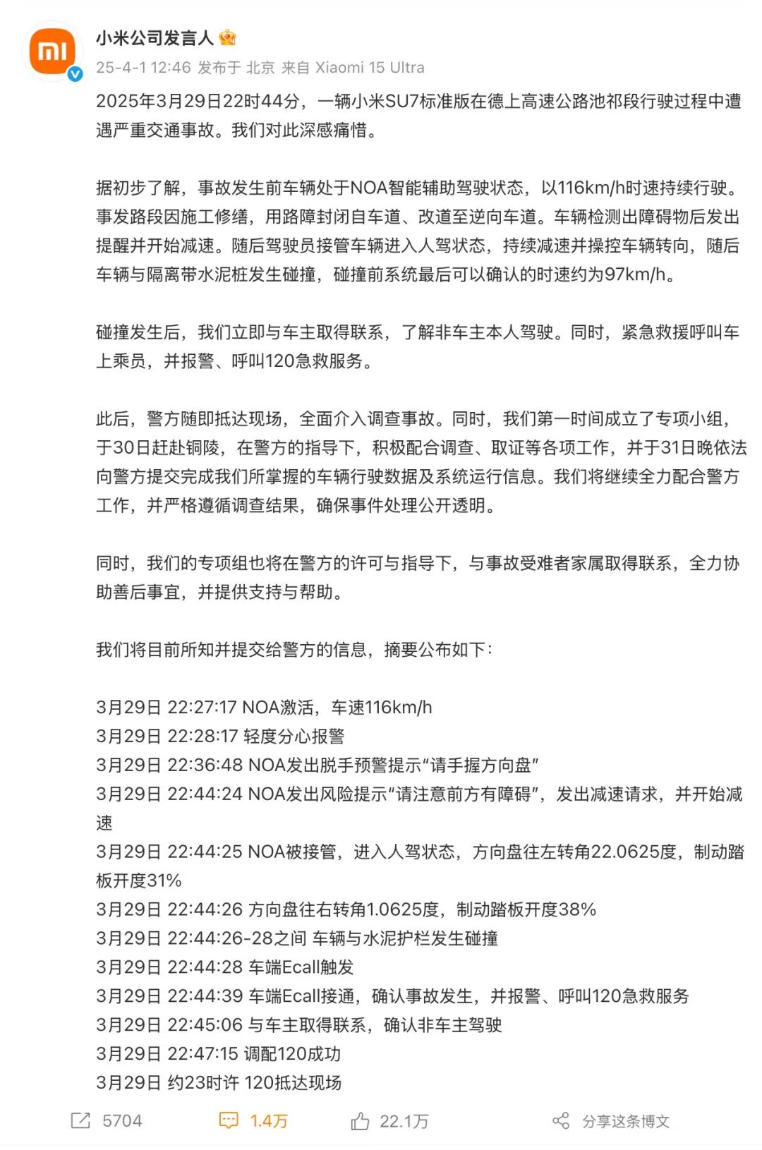 “小米公司发言人”于昨日 12:46 对外发布通告,初步披露事故车辆遭遇碰撞前后的车速、智能辅助驾驶 NOA 情况等,尚未对外回应包括 AEB、车门以及电池问题。