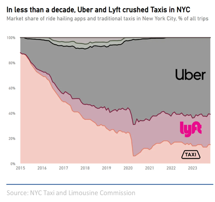 ② 经营性车辆内部,网约车继续抢占出租车的份额:根据纽约市官方部门的数据,在2023~2024年间纽约传统出租车仍占有约20%的市场份额。按照国内的经验,美国全国范围内,出租车的市场份额应当比纽约市的要低些(许多小城市可能并无出租车运营,但有网约车运营的概念会更高)。再考虑到有人驾驶出租车大概率也不会被完全替代,我们按自动驾驶技术普及后,网约车在经营车辆内部的份额将从80%+提升到95%+。