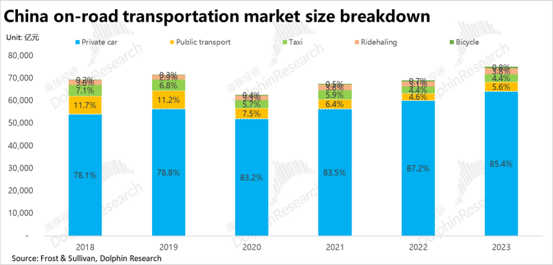 2、自动驾驶技术对出行市场的影响,应当更多反映在乘车出行结构的变化上(各种途径的占比)。首先从历史数据来看,中国乘车出行各渠道(按金额)的占比在2018~23年间的变化趋势上,中国私家车出行比重最高且在持续上升(近期已达约85%);公共交通的比重持续下降(从近12%到约5%);网约车+出租车的整体比重大约稳定在7%~10%之间,趋势上两者内部网约车在侵蚀出租车的份额。