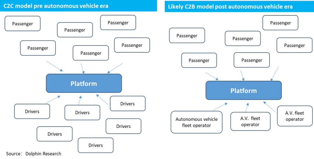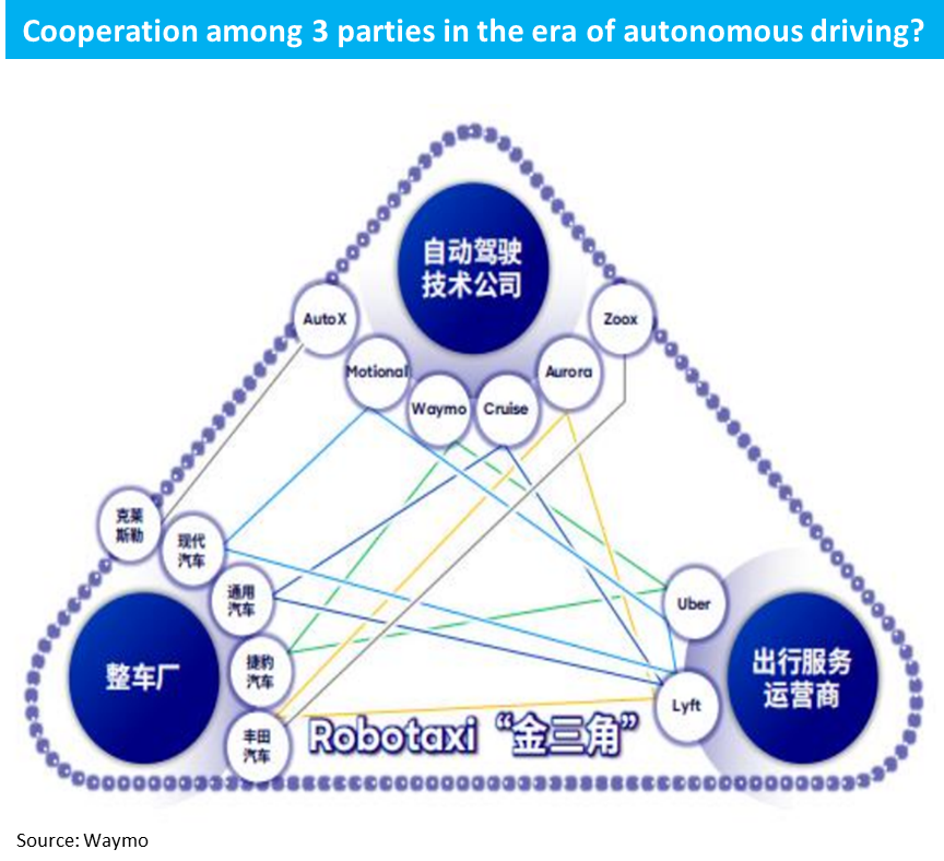以上分析,我们都从将网约车行业视作一个整体的角度。但随着自动驾驶技术的普及,势必引入更多的行业参与者(包括且不限于自动驾驶技术的提供方,无人网约车的运营方等),给当前已相对稳定的竞争格局带来明显的改变。